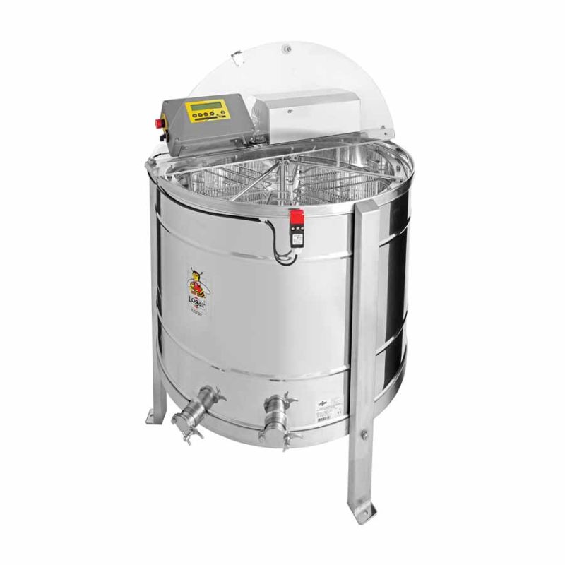 6-Waben Selbstwendehonigschleuder von Logar, mit Motorantrieb 250 W / 230 V, vollautomatischer Steuerung und integrierter Sicherheitseinrichtung, welche den Motor bei Deckelöffnung automatisch abschaltet. Die Schleuder ist mit zwei rostfreien Quetschhähnen 6/4'' ausgestattet; einer ist am tiefstmöglichen Punkt eingebaut, damit der gesamte Honig abfließen kann. Alle Teile, die mit Honig in Berührung kommen, bestehen aus lebensmittelzugelassenen Materialien. Der Deckel ist aus durchsichtigem Acrylglas.