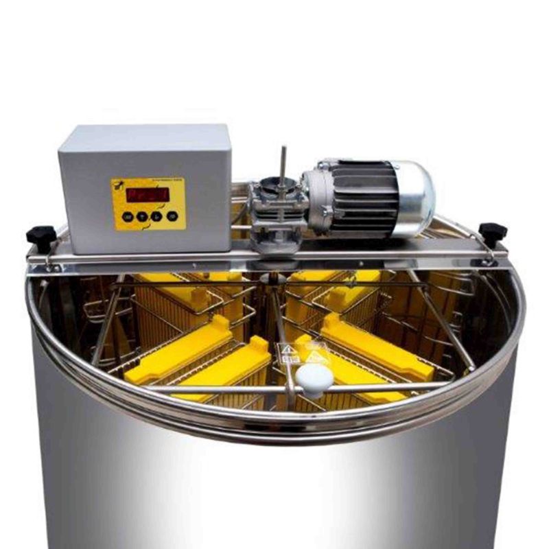 8‑Waben Selbstwendehonigschleuder mit Motorantrieb 110W/230V, vollautomatischer Steuerung und Sicherheitsschalter, welcher den Motor bei Deckelöffnung automatisch abschaltet. Die Wabentaschen in der Honigschleuder sind doppelt, zwischen ihnen befindet sich ein Blech, über welches der Honig abfließt. Modernste Technik ermöglicht uns eine innovative Ausarbeitung des Honigschleuderbodens. Der Boden des Kessels ist nahtlos geschweißt und Richtung Auslauf geneigt. Der rostfreie Quetschhahn ist am tiefst möglichen Punkt angeschweißt, damit der gesamte Honig aus der Honigschleuder abfließen kann. Alle Teile der Honigschleuder, die mit dem Honig in Berührung kommen, bestehen aus lebensmittelzugelassenen Materialien. Der Deckel ist aus durchsichtigem Acrylglas. Eine besondere Konstruktion der Standfüße gewährt der Honigschleuder eine stabile Standsicherheit.