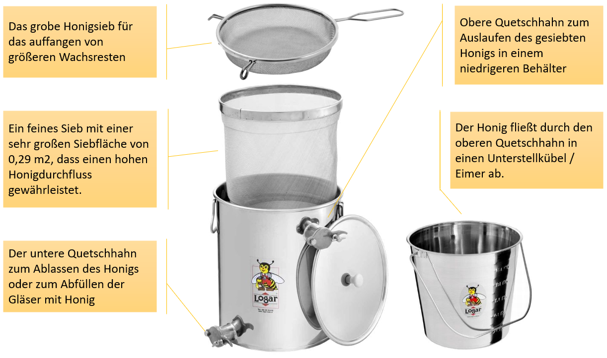 - Vorteile: sehr große Siebfläche, hoher Honigdurchfluss, verstopft nicht bei ganztägigem Sieben, erleichtert vollständige Honigreinigung
