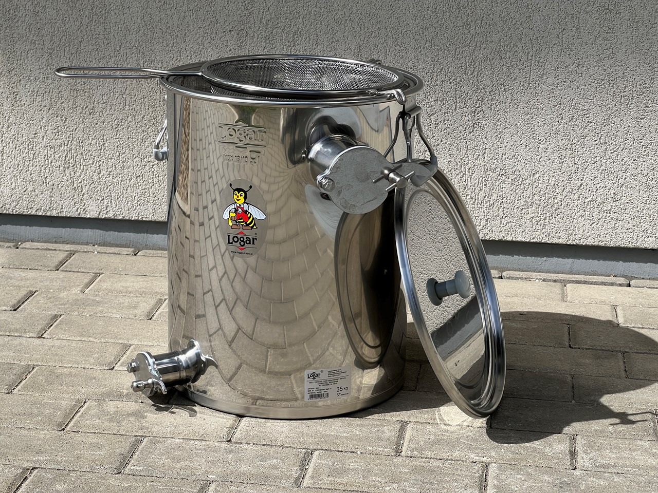 Ausstattung: 2 angeschweißte Quetschhähne (oberer XL-Quetschhahn für erhöhten Honigfluss), feines Innensieb aus Edelstahl-Gitterstoff